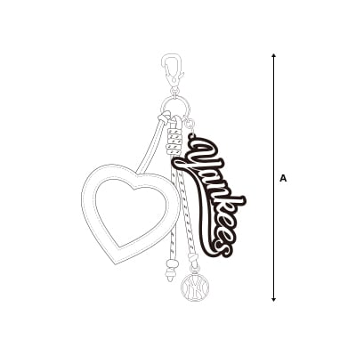 • A bag charm with a heartshaped mirror charm, rubber decoration, and metal medal decoration.